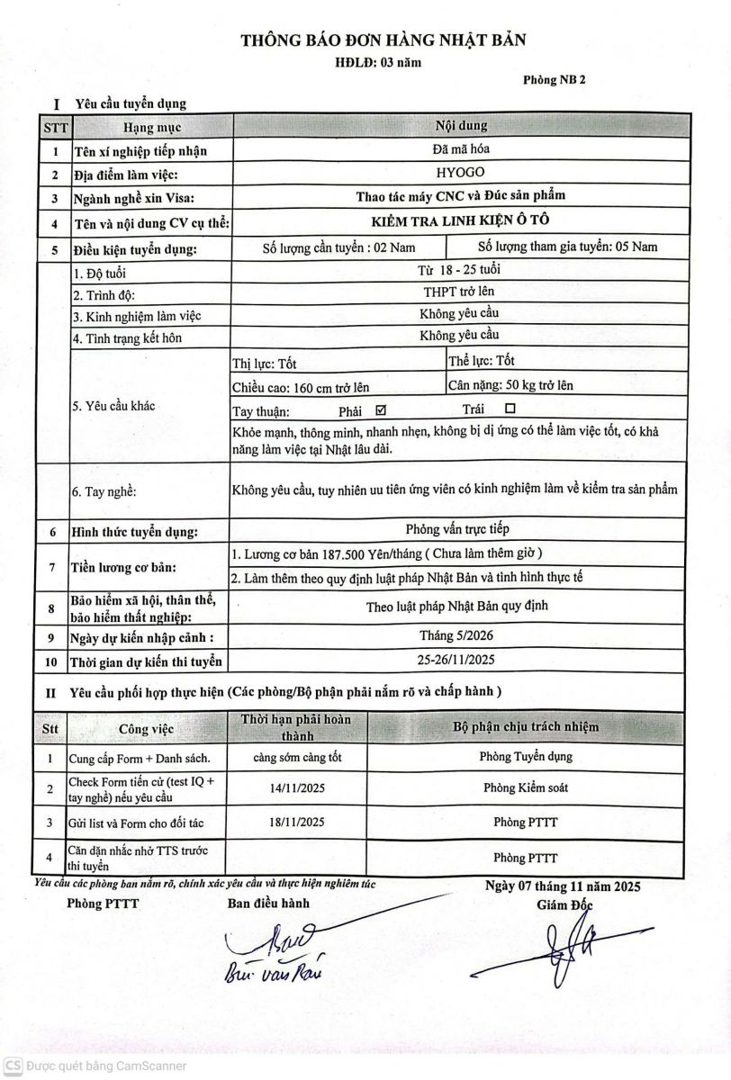 : Đơn hàng thực tập sinh Nhật Bản tháng 11/2025