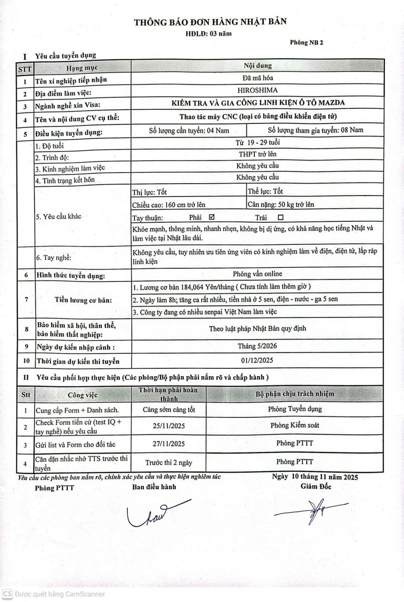 THÔNG TIN TUYỂN DỤNG: Đơn hàng thực tập sinh Nhật Bản tháng 12/2025